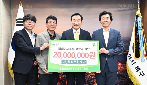(울산=연합뉴스) 장지현 기자 = 울산시 북구는 2일 재단법인 유성문화재단이 지역 인재 육성을 위한 장학금 2천만원을 북구교육진흥재단에 기탁했다고 밝혔다.