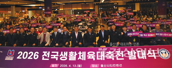 ▲ ‘2026 전국생활체육대축전’을 앞두고 울산시 선수단이 13일 울산UCC 안다미로홀에서 발대식을 연 가운데 김두겸 울산시장, 김철욱 울산시체육회 회장 등 내빈들과 선수단이 기념촬영을 하고 있다. 울산시체육회 제공