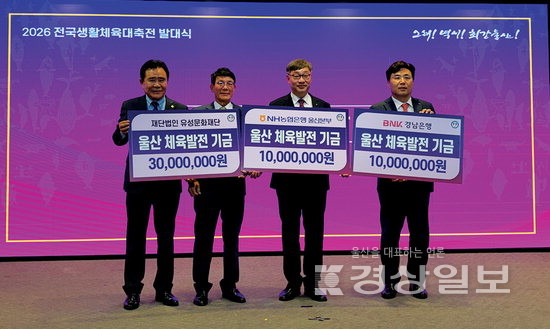 ▲ 유성문화재단이 3000만원, 울산경남은행과 NH농협은행 울산본부가 각각 1000만원을 울산시체육회에 전달했다. 울산시체육회 제공전국 생활체육 동호인들의 화합의 장인 ‘2026 전국생활체육대축전’을 앞두고 울산시 선수단이 발대식을 열고 필승 의지를 다졌다.